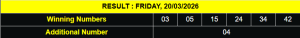 RESULT IRISH TOTO FRIDAY, 20 MARCH 2026