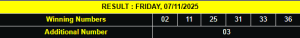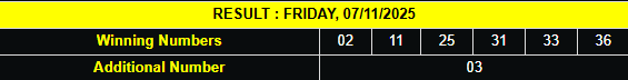 Diurutkan : 02-11-25-31-33-36 bola tambahan 03