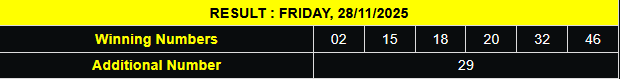 Diurutkan : 02-15-18-20-32-46 bola tambahan 29
