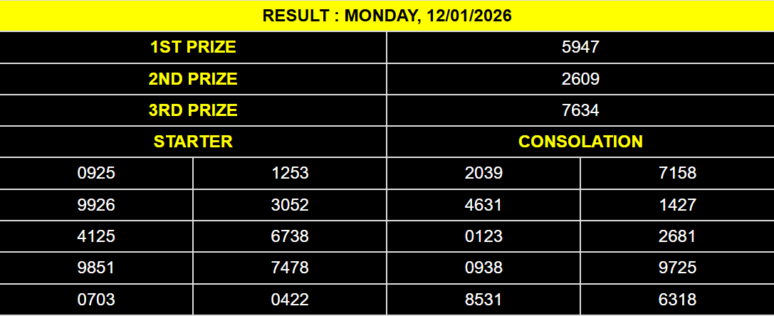 1st Prize : 5947 (Pasang Rp 1000, hadiah 4Dx5JT/3Dx600rb/2Dx80rb)